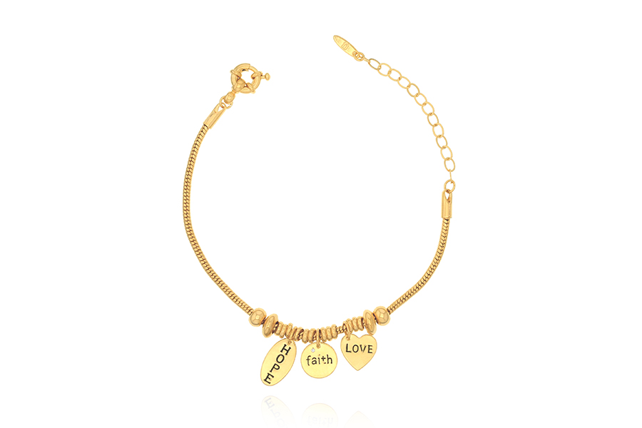 PULSEIRA BANHADA EM OURO, ELO 1,20mm COM BOLINHA OVAL, 17cm COMPRIMENTO, PONTO DE LUZ 4,50mm, TE AMO TITIA 14mm DIÂMETRO COM CORAÇÃO