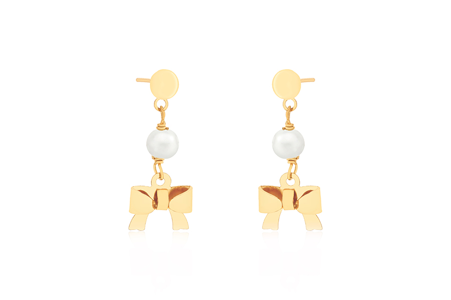 BRINCO BANHADO EM OURO, BASE RETANGULAR CRAVEJADA, 2 ELOS RETANGULARES LISOS