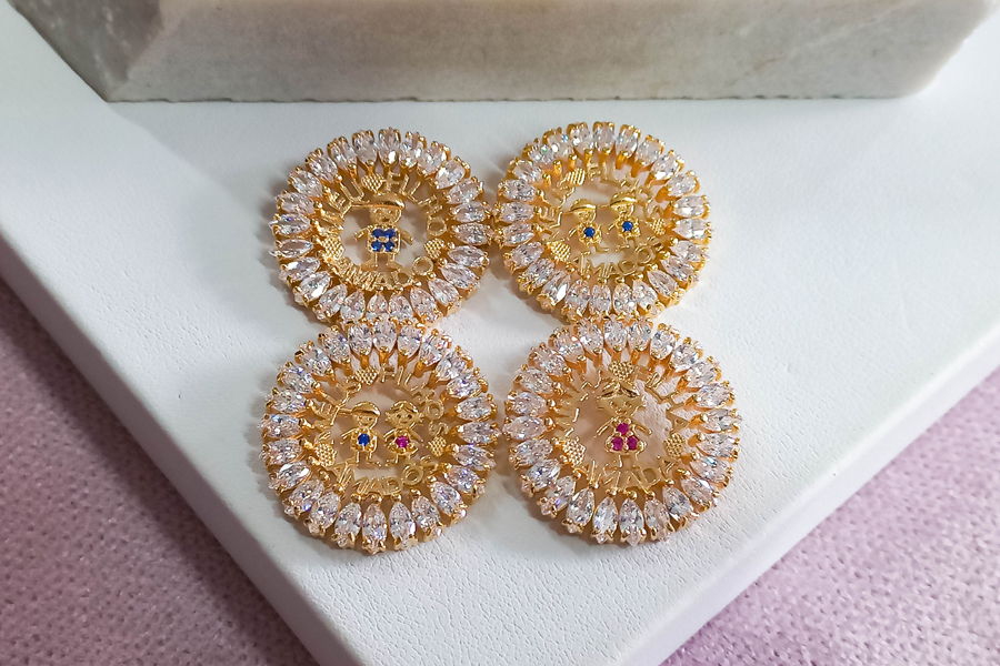 PINGENTE BANHADO EM OURO CRISTAL 16mm DIÂMETRO, BONECOS