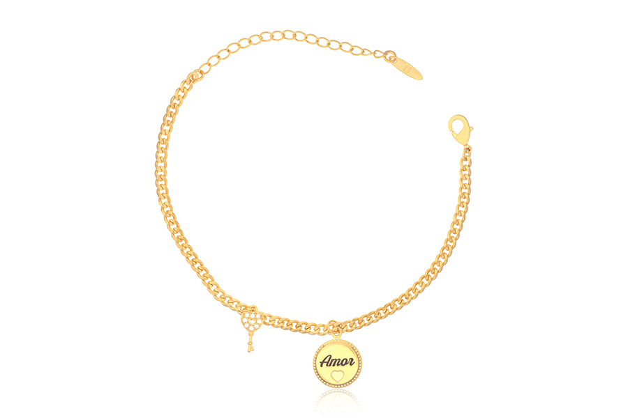 PULSEIRA BANHADA EM OURO, ELO PORTUGUÊS 2,50mm DIÂMETRO, 16cm COMPRIMENTO E CORAÇÃO 10mm LARGURA I LOVE MUSIC (EU AMO MÚSICA)
